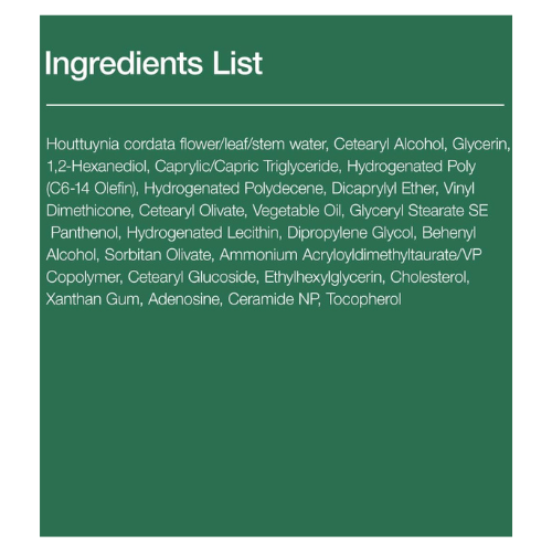 A soothing cream to strengthen and repair damaged skin barrier, providing deep hydration. Skin TypeAll, Dry, Sensitive BenefitsDeep Hydration, Calms Irritated Skin TextureNon-Greasy Cream Moisturizing Soothing Fragrance-Free Ingredients Houttuynia Cordata Extract, Cetearyl Alcohol, Glycerin, Cyclohexasiloxane, Butylene Glycol, 1,2-hexanediol, Dicaprylyl Ether, Caprylic/capric Triglyceride, Hydrogenated Poly(C6-14 Olefin), Hydrogenated Polydecene, Glyceryl Stearate Se, Cetearyl Olivate, Sorbitan Olivate, Vegetable Oil, Panthenol, Hydrogenated Lecithin, Dipropylene Glycol, Behenyl Alcohol, Ammonium Acryloyldimethyltaurate/vp Copolymer, Cetearyl Glucoside, Cholesterol, Xanthan Gum, Adenosine, Ceramide Np, Glucose, Water, Ethylhexylglycerin How to use After applying your serum or ampoule, use both morning and evening. Follow with sunscreen in the morning. Smooth over face and neck with fingertips or a spatula. ALL DAY DEEP MOISTURE Restore your skin’s barrier with potent ingredients like Ceramides and Panthenol. Infused with 70% Heartleaf Extract, known for its soothing and calming effects, this daily facial moisturizer is suitable for all skin types, especially sensitive and dry skin. Its lightweight texture ensures immediate hydration and rapid absorption. PERFECT MOISTURIZER FOR SENSITIVE & DRY SKIN FORMULATED WITH NATURAL INGREDIENTS Contains 70% Heartleaf Extract, known best for its soothing and calming effects REPAIRS DAMAGED SKIN BARRIER Contains Ceramides and Panthenol, effective ingredients to repair damaged skin barrier NON-GREASY TEXTURE Creamy yet non-greasy consistency provides instant hydration and quickly absorbs into the skin GENTLE & CALMING INGREDIENTS HEARTLEAF EXTRACT Soothes dry and sensitive skin fromirritation and helps maintain the skin’s moisture. CERAMIDE Provides a deep, inner hydration for the skin. PANTHENOL Helps reinforce the skin’s weakened barrier. CREAM RITUAL Smooth over face and neck. May be used with a small spatula or your fingertips. Use after ampoule as both morning and night skincare regimen. Follow up with sunscreen in the morning routine. Multiple layers are recommended for dy winter season.
