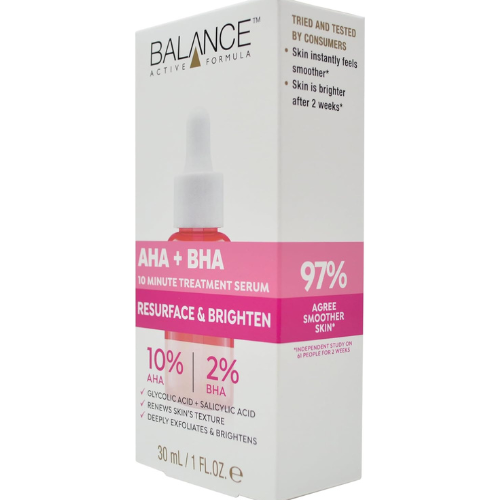 Product Description Balance Active Formula AHA + BHA Retexturising Serum is formulated with 10 Percent AHA (Glycolic Acid) and 2 Percent BHA (Salicylic Acid). This combined serum deeply exfoliates, brightens and improves skin texture. Renews skin’s texture Deeply exfoliates and brights Indications Suitable for use 2-3 times a week only P.when(‘A’).execute(function(A) ( A.on(‘a:expander:toggle_description:toggle:collapse’, function(data) ( window.scroll(0, data.expander.$expander( 0).offsetTop-100); )); )); Ingredients Ingredients Aqua (Water), Propylene Glycol, Glycolic Acid, Propanediol, Salicylic Acid, Panthenol, PEG-40 Hydrogenated Castor Oil, Trideceth-9, Phenoxyethanol, Xanthan Gum, Caprylyl Glycol, Allantoin, Benzophenone-4, Disodium EDTA, Sodium Hydroxide, Caramel, CI 17200 (Red 33). Directions Use in the evening. Apply evenly to a clean, dry face. Leave for up to 10 minutes and rinse with lukewarm water. Suitable for use 2-3 times a week only. Avoid direct sun exposure, apply broad-spectrum SPF after use