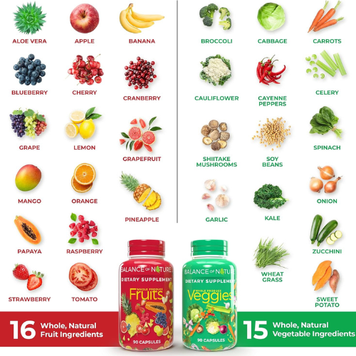 Balance of Nature Fruits and Veggies – Whole Food Supplement with Superfood Fruits and Vegetables for Women, Men, and Kids – 90 Fruit Capsules, 90 Veggie Capsules – 1 Set