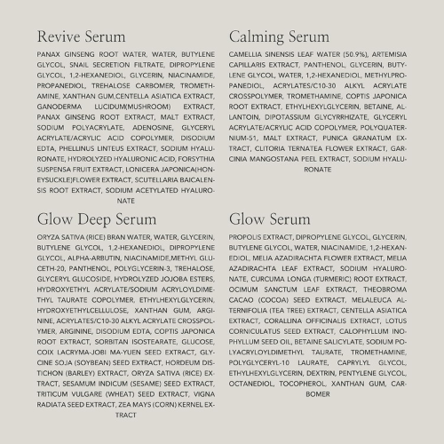 - Glow Deep Serum : Rice + Alpha-Arbutin Solution : Rice bran water 68% + Alpha-Arbutin 2% Notable ingredients : Glycerin, Niacinamide, Soybean Seed Extract, Barley Extract, Rice Extract, Sesame Extract Texture : Watery and lightweight texture Benefits : Anti-pigmentation, Brightening
