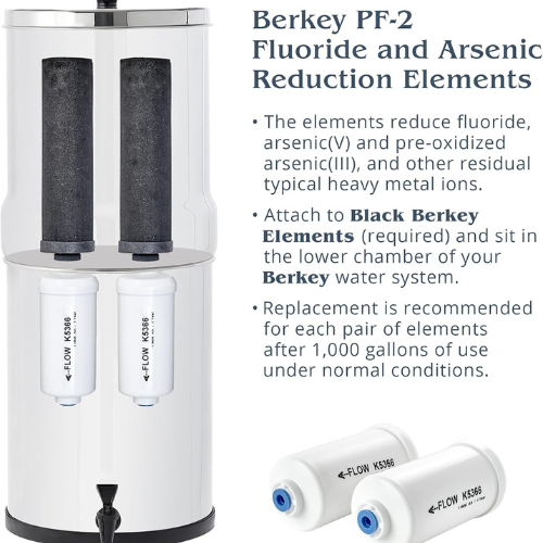 “Product Description Berkey PF-2 Fluoride and Arsenic Reduction Elements are designed for use in conjunction with Black Berkey Elements to adsorb fluoride, arsenic(V) and pre-oxidized arsenic(III), and other residual typical heavy metal ions. We recommend replacing Berkey PF-2 Fluoride and Arsenic Reduction Elements after 1,000 gallons of use, under normal conditions. Berkey PF-2 Fluoride and Arsenic Reduction Elements are backed by independent, third-party testing. Berkey PF-2 Fluoride and Arsenic Reduction Elements attach to Black Berkey Elements, and sit in the lower chamber of Big Berkey, Travel Berkey, Berkey Light, Royal Berkey, Imperial Berkey and Crown Berkey systems. From the Manufacturer Made for the extreme and enjoyed every day, Berkey systems are the gold standard in gravity-fed water systems. Berkey systems have been the trusted choice of adventurers, relief agencies, preppers, off-grid homesteaders, and families for over 20 years. Berkey gravity-fed water systems are available in 7 sizes and are ideal for use at home, camping, fishing, RVing, or during unexpected emergencies and disaster scenarios. Enjoy delicious, refreshing water for just pennies per gallon.”