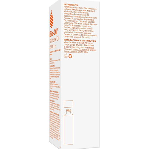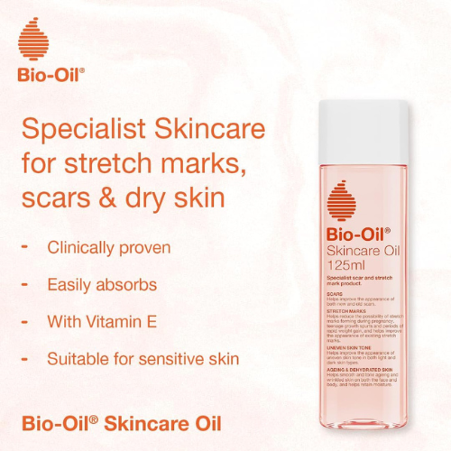 Bio-Oil Skincare Oil Bio-Oil Skincare Oil is a specialist skincare product formulated to help improve the appearance of scars, stretch marks and uneven skin tone. Helps improve the appearance of scars Bio-Oil Skincare Oil helps to improve the appearance of new or old scars. Whether from: Surgery Accidents Burns Insect bites Scratches Or conditions such as; acne or chickenpox Although younger scars will have a greater chance of improvement, studies have shown that older scars also benefit from regular use of Bio-Oil Skincare Oil. Helps improve the appearance of stretch marks Bio-Oil Skincare Oil has been clinically proven to help reduce the possibility of stretch marks forming during: Pregnancy Teenage growth spurts Periods of rapid weight gain e.g. body building Throughout pregnancy, when applied twice daily from the second trimester, Bio-Oil Skincare Oil helps to reduce the possibility of pregnancy stretch marks from forming. Bio-Oil Skincare Oil also helps improve the appearance of existing stretch marks. The formulation works together to help improve the skins texture and increase its elasticity. Helps improve uneven skin tone Bio-Oil Skincare Oil helps improve the appearance of pigmentation marks and blemishes caused by hormonal fluctuations, skin lighteners or excessive sun exposure, in both light and dark skin types. Directions Bio-Oil Skincare Oil should be massaged in a circular motion on the face or body until fully absorbed. Apply twice daily for a minimum of three months. Bio-Oil Skincare Oil should not be applied to an open wound or broken skin. It is safe to use Bio-Oil Skincare Oil on a scar as soon as the skin on the surface has fully healed. Individual results will vary. Safety information For external use only. Do not use on broken skin. In the unlikely event of skin irritation, discontinue use. Avoid contact with eyes.