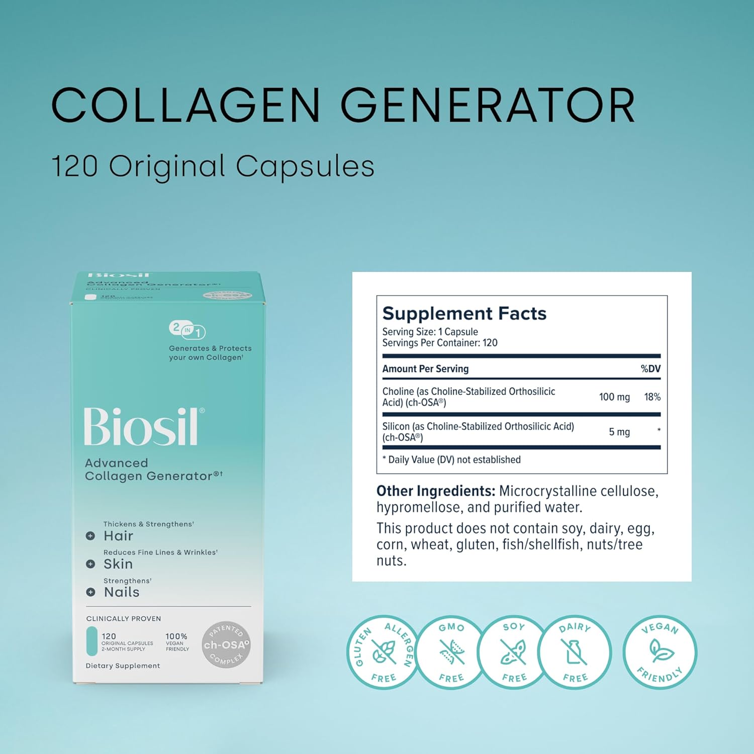 BioSil – 120 Vegan Capsules – with Patented ch-OSA Complex – Increase Collagen Production for Beautiful Hair, Skin & Nails – GMO Free – 120 Servings
