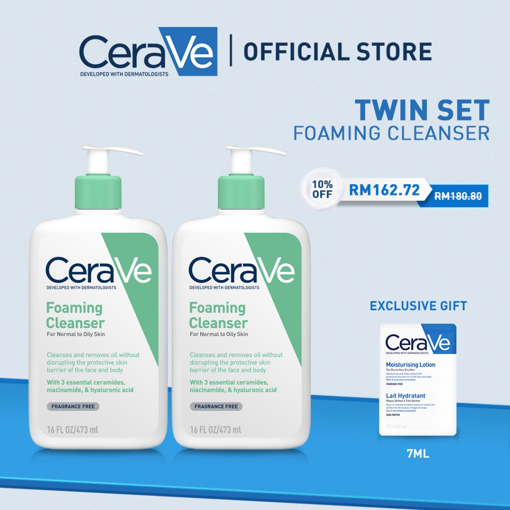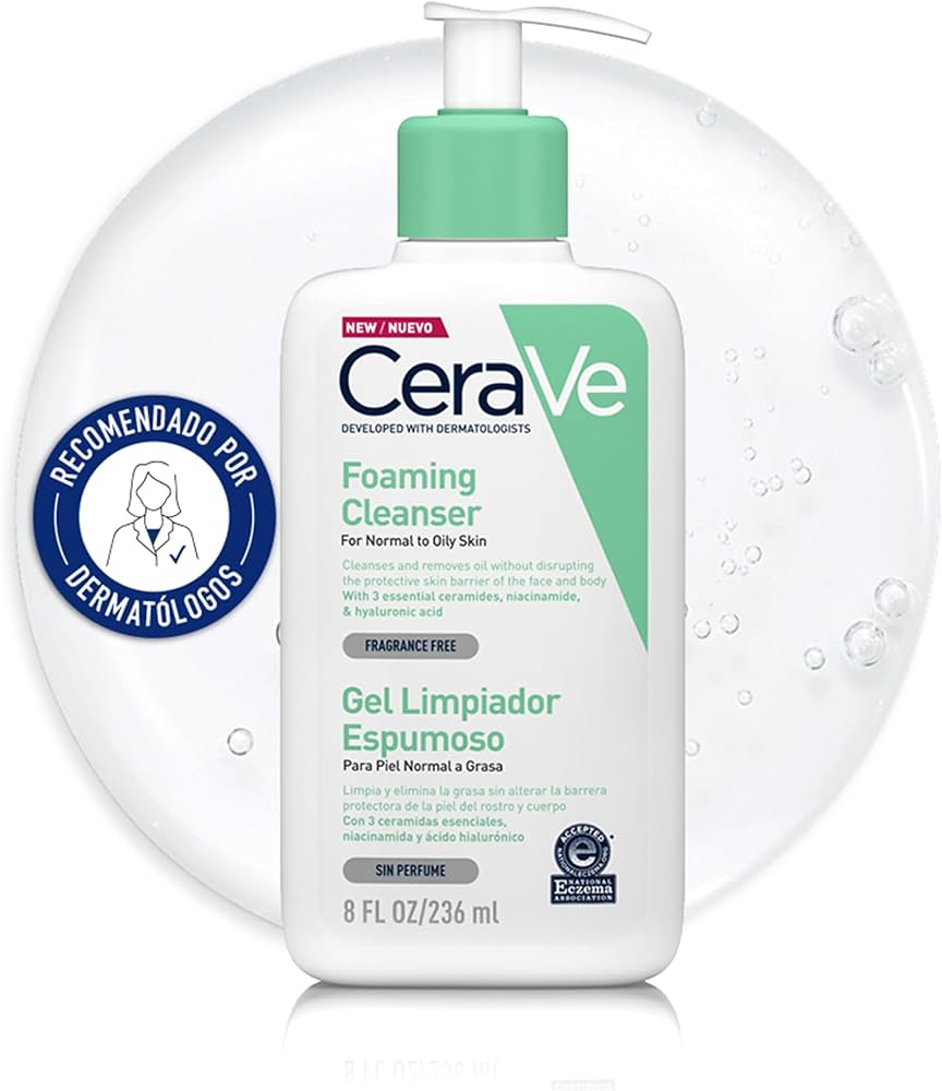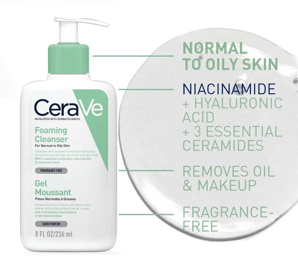 Developed with dermatologists, CeraVe Foaming Cleanser has a unique formula with three essential ceramides (1, 3, 6-II) that cleanses and removes oil without disrupting the protective skin barrier. Gentle foaming action refreshes and cleanses skin, including removing excess oils and makeup, without over-stripping the skin or leaving the skin feeling tight and dry. This gel-based foaming cleanser is an effective yet non-irritating way to cleanse and care for normal to oily skin. This face wash is formulated with three essential ceramides, hyaluronic acid, and niacinamide. •Non-comedogenic •Non-drying •Non-irritating •Fragrance-free •Suitable for normal to oily skin Key Ingredients: •Ceramides: Essential for healthy skin, ceramides help restore and maintain the skin’s natural barrier •Hyaluronic Acid: This ingredient attracts hydration to the skin’s surface and helps the skin retain moisture •Niacinamide: Helps calm the skin