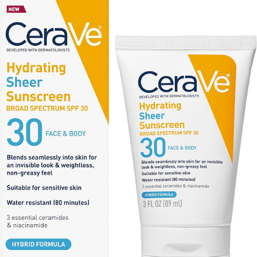 CeraVe Hydrating Sheer Sunscreen SPF 30 for Face and Body | Mineral & Chemical Sunscreen with Zinc Oxide, Hyaluronic Acid, Niacinamides and Ceramides| Paraben Free Fragrance Free | 3 Ounces