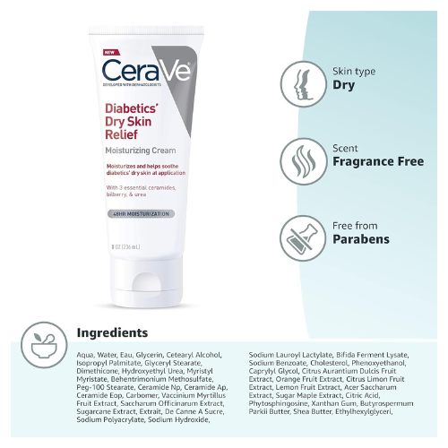 Developed with dermatologists, CeraVe Diabetics’ Dry Skin Relief Moisturizing Cream moisturizes and helps soothe diabetics’ dry skin at application. This formula, with Billbery and Urea, helps attract and retain moisture for all day hydration. Also formulated with three essential ceramides to help restore and maintain your skin’s natural protective barrier.