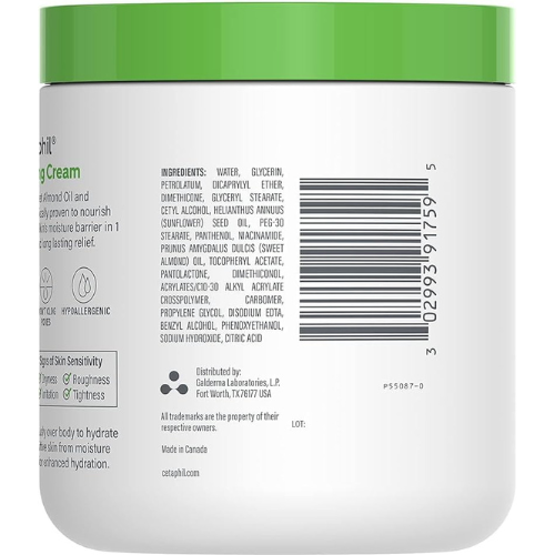 Cetaphil body moisturizing cream for dry to very dry skin instantly replenishes intensely nourishes and soothes skin dryness for 48 hoursclinically proven to restore skins moisture barrier in 1 week binds water to the skin preventing moisture loss to hydrate and protect skin from drynessnew and improved ingredient blend now with hydrating glycerin and skin essential vitamins b5 panthenol and b3 niacinamidedeveloped for even the most sensitive skin the hypoallergenic non comedogenic formula is free of fragrances parabens and sulfatesfrom the 1 doctor recommended sensitive skincare brand
