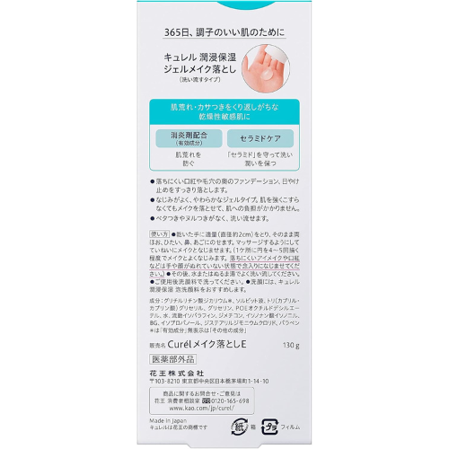 CUREL Makeup Cleansing Gel thoroughly removes makeup including long lasting foundation from deep within pores while protecting ceramide. Soft gel spreads easily on skin without the need for excessive rubbing and leaves skin comfortably clean. It also helps to improve your skin’s natural barrier function, soothe and protect skin from dryness.