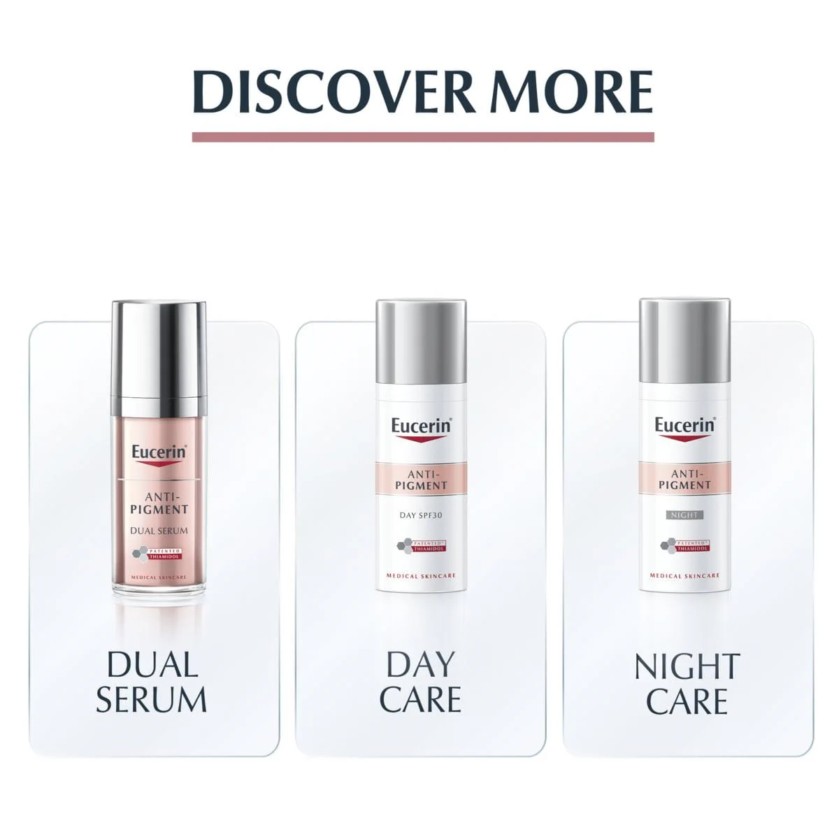 - RECEIVE COMPLETE CARE: Discover the entire Eucerin Even Pigment Perfector range to provide complete care for even, radiant skin – 1) Day SPF 30 2) Dual Serum 3) Dark Circle Illuminating Eye Care.