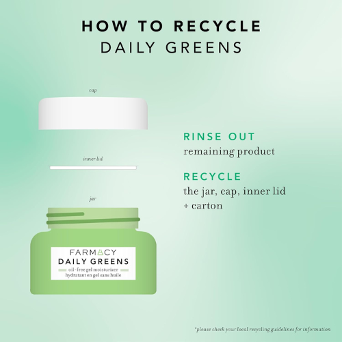“About the Moisturizer Start every morning the right way with the silky smooth Daily Greens facial moisturizer. The gel is oil-free, silicone-free, and delivers lightweight, lasting hydration without leaving skin feeling greasy. This vegan, cruelty-free formula contains hyaluronic acid and a blend of phytonutrients known to help clear pores and reduce unwanted shine. [1.7 fl.oz / 50ml] Moringa Seed Extract & Moringa Water: Purify and refresh skin by removing impurities caused by pollution. Refreshing and lightweight formula helps soothe minor irritations. About Farmacy Farmer Cultivated & Scientist Activated. We use cutting-edge science to harness the healing powers of ingredients found in nature. The result is farm-to-face skincare that lives up to its full potency and potential through clean, thoughtful formulas.”