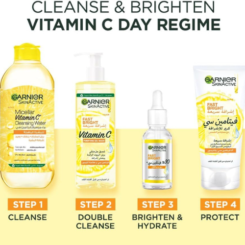Garnier Fast Bright Vitamin C + Niacinamide Booster Serum has 30x Pure Vitamin C. Tired of dull skin, pigmentation, and dark spots? Breathe new life into your skin and get a bright, spot-less complexion with Garnier Fast Bright Vitamin C + Niacinamide Serum. This Vitamin C + Niacinamide serum is an anti-oxidant rich face serum improves skin brightness and evens skin tone from first application and reduces dark spots in just 3 days. Experience fast and visible results with the Garnier Fast Bright Serum.
