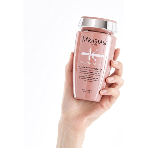 Bain Chroma Respect shampoo moisturises and protects colour treated hair. Enriched with Amino Acid and Centella Asiatica, it strengthens the fibres, reduces porosity, and protects colour from fading. Sulphate, silicone, and paraben-free.