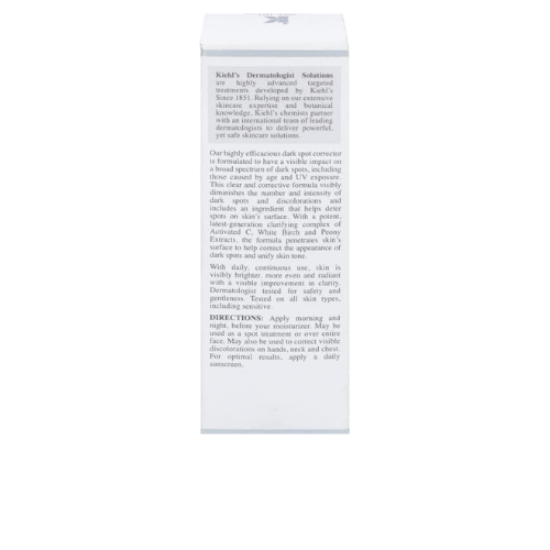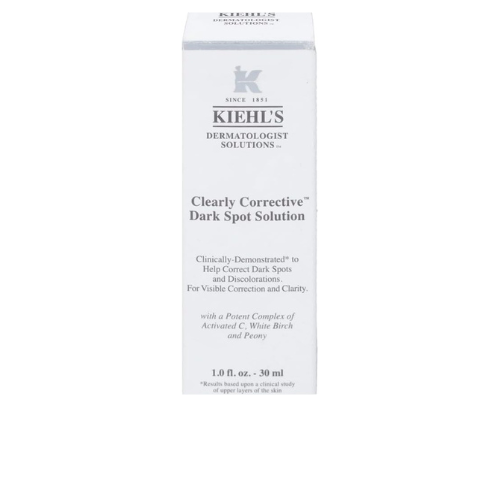 Kiehl’s Clearly Corrective Dark Spot Solution – A serum that diminishes the appearance of dark spots. Highly efficacious dark spot corrector is formulated to have a visible impact on a broad spectrum of dark spots. This clear and corrective formula visibly diminishes the number and intensity of dark spots and discolouration. With a potent, latest-generation clarifying complex of Activated C, White Birch and Peony Extracts, the formula penetrates skin’s surface to help correct the appearance of dark spots and unify skin tone. With daily, continuous use, skin is visibly brighter, more even and radiant with a visible improvement in clarity. Dermatologist tested for safety and gentleness. Tested on all skin types, including sensitive. Product Features: Brand: Kiehl’s Type: Eye Concealer Are batteries needed to power the product or is this product a battery: No Size: 30 ml