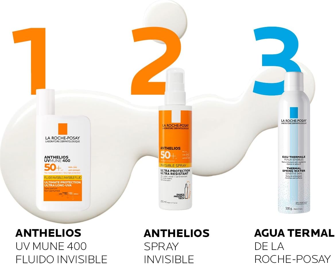 La Roche Posay Anthelios UVMune 400 Invisible Fluid SPF50+ NON-PERFUMED : With MEXORYL400, the only UV filter against the most insidious UV rays: ULTRA LONG UVA*. Ultimate protection (UVB + UVA + ULTRA LONG UVA) against deep cell damage. Tested on sensitive , reactive, and intolerant skin. Suitable for all types of skin, and all phototypes. Without perfume. Ultra-resistant: water and sand. High tolerance. Anti-eye stinging. Invisible, lightweight texture. XL-PROTECT, a patented filtering technology, provides broad-spectrum very high UVB/UVA protection and helps protect against damage caused by pollution and infrared. MEXORYL400; a new exclusive UV filter that protects against even the most insidious UV rays: ULTRA LONG UVA* up to 400nm. Powered by NETLOCK TECHNOLOGY for Ultimate protection, and ultra resistance in an invisible texture. Tested under dermatological control on sensitive and reactive skin. Tested under ophthalmological control on sensitive eyes and eye area. Tested on contact lens wearers. Allergy tested.