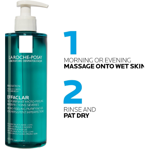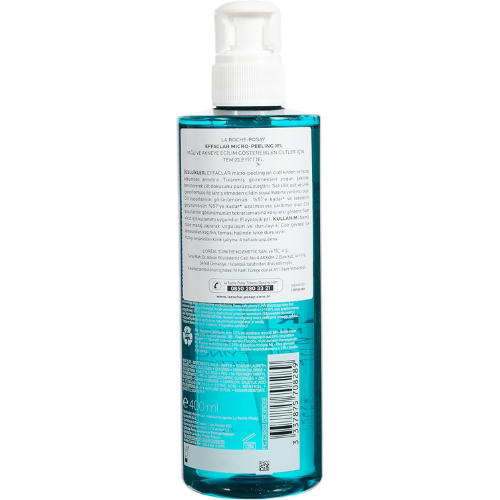 The first La Roche-Posay cleanser formulated with micro-exfoliating and purifying agents. Acts on persistent imperfections and sebum while bringing a maximum of comfort to acne-prone skin, even on body. Formula tested under dermatological control. Hypoallergenic. Physiological pH. Tested on oily acne-prone skin. Allergy-tested. Thanks to selected exfoliating agents that leaves the skin texture smoother, EFFACLAR Micro-peeling gel intensely purifies oily skin, deeply unclogs pores, and removes excess sebum. It helps reducing progressively and durably persistent imperfections including marks, and preventing recurrence.