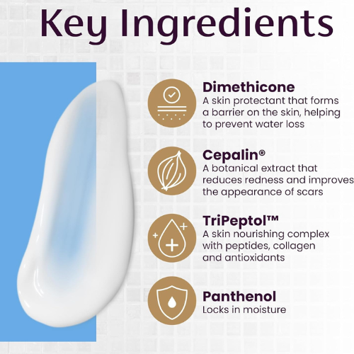Active Ingredients: Dimethicone (2 %), Skin protectant. Inactive Ingredients: Water, Cetearyl Alcohol, Pentylene Glycol, C12-15 Alkyl Benzoate, Dicaprylyl Carbonate, Glycerin, Arachidyl Alcohol, Alcohol, Aloe Barbadensis Leaf Juice, Cyclopentasiloxane, Behenyl Alcohol, Cyclohexasiloxane, Arachidyl Glucoside, Allium Cepa (Onion) Bulb Extract, Fragrance, Cetearyl Glucoside, Tocopheryl Acetate, Hydroxyethyl Acrylate/Sodium Acryloyldimethyl Taurate Copolymer, Hydroxyethylcellulose, Glycine, Panthenol, Hydrolyzed Collagen, PEG-400, Polysorbate 60, Sorbitan Isostearate, Citric Acid, Sodium Hydroxide, Alanine, Arginine HCI, Aspartic Acid, Glucose, Glutamic Acid, Isopropyl Alcohol, Leucine, Lysine HCI, Mannitol, Sodium Lactate, Sorbitol, Tromethamine, Valine, Potassium Sorbate, Sodium Benzoate, Tocopherol, Bis (Tripeptide-1) Copper Acetate, Histidine HCI, Hydrolyzed Soy Protein, Isoleucine, Phenylalanine, Tyrosine.