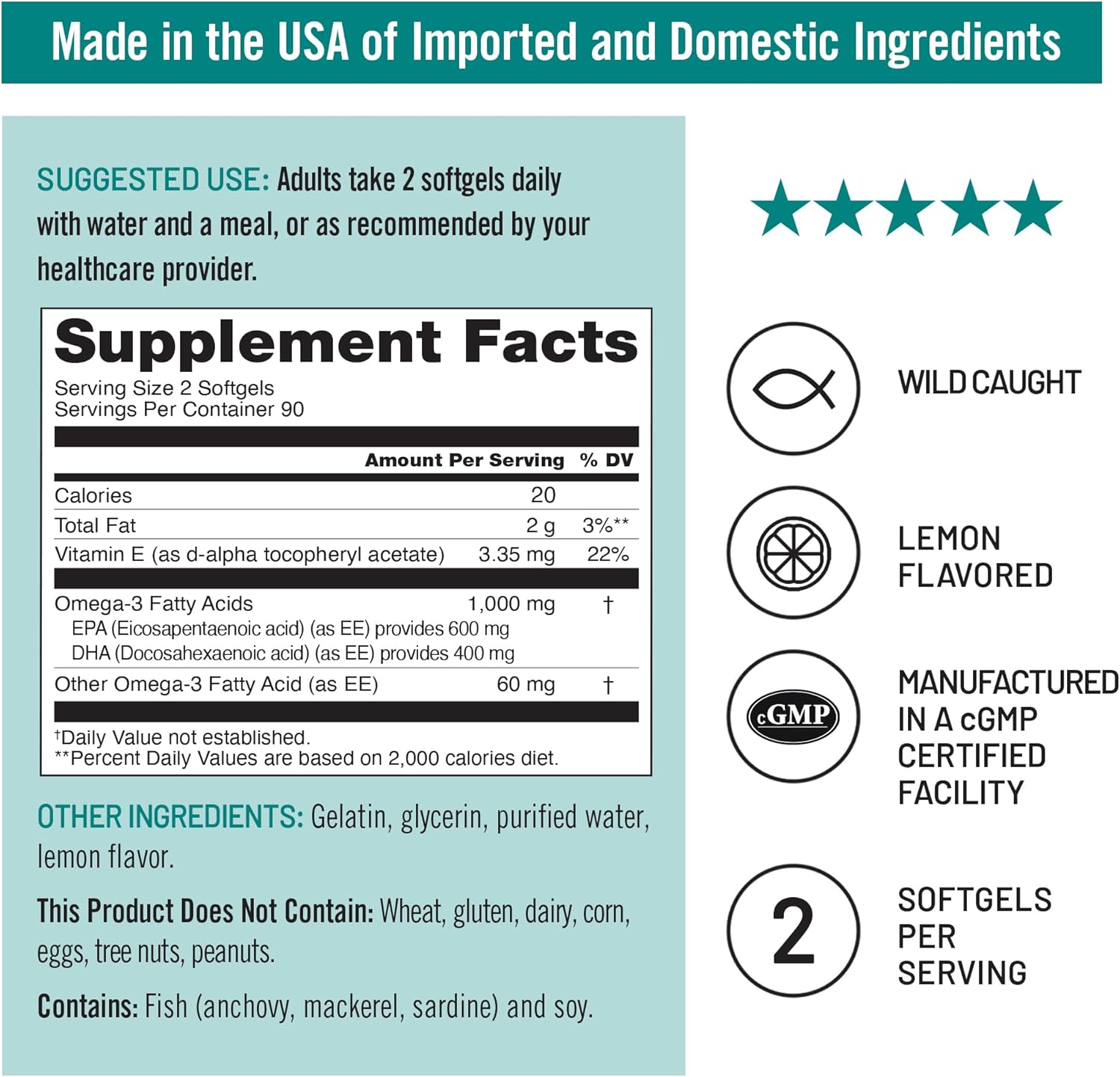 Say goodbye to stinky fish oil supplements and say hello to NatureWise Omega 3 + Vitamin E softgels. Every serving of this omega 3 supplement provides 1060 mg of Omega 3 fatty acids with the added benefits of vitamin E. Why take omega 3 fish oil with vitamin E? Because this dynamic duo works together to support your overall heart health, as well as your eye health. Vitamin E is a fat-soluble vitamin with antioxidant properties that supports omega-3 fatty acids in the body. Omega 3 fatty acids also support overall joint health, comfort, and flexibility. NatureWise Omega 3 + Vitamin E uses a high-quality blend of fish oils to deliver the best source of omega-3 fatty acids. Our Omega 3 supplement is made with premium omega 3 fish oils with the optimal dose of 600 mg EPA and 400 mg DHA fatty acids, and 60 mg of other fatty acids, so your body gets support for your overall heart, brain, joint, and eye health.* NatureWise Omega 3 softgels are gluten-free and non-GMO. These softgels do not contain wheat, gluten, eggs, dairy, peanuts, tree nuts, and corn. This product contains fish (anchovy, mackerel, sardine) and soy. *Statements regarding dietary supplements have not been evaluated by the FDA and are not intended to diagnose, treat, cure, or prevent any disease or health condition.