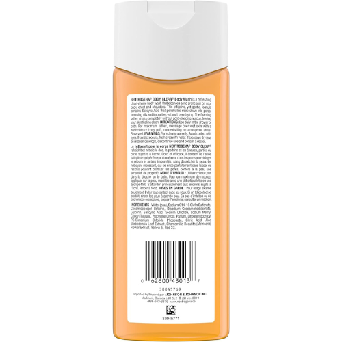 Neutrogena body clear body wash is a refreshing, cleanrinsing body wash that helps fight breakouts on your back, chest and shoulders. This effective, yet gentle formula contains a proven acnefighting ingredient that treats and helps prevent breakouts without overdrying and irritating your skin. The foaming lather rinses completely without pore clogging residue, leaving your skin feeling clean.