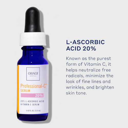 Obagi Medical Professional-C Serum with 20 percent L-Ascorbic Acid is the most bioavailable form of Vitamin C, for optimal skin absorption and results. As we age our skin doesn’t snap back like the way it did in our younger years, resulting in more signs of skin aging such as the appearance of fine lines and wrinkles. L-Ascorbic Acid is the active form of Vitamin C and is proven to help reduce the look of fine lines and wrinkles.