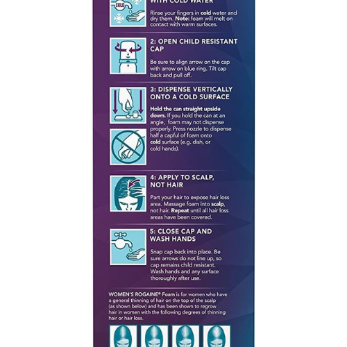 [Predicted value: A series of steps related to applying the foam to the scalp, e.g., ‘1. Part your hair to expose the scalp. 2. Apply a small amount of foam to the affected area. 3. Gently massage the foam into the scalp. 4. Repeat the process if necessary. 5. Wash your hands after application.’]