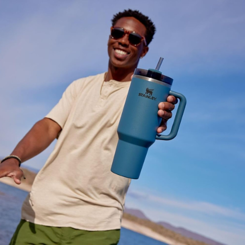 Constructed of recycled stainless steel for sustainable sipping, our 40 oz Quencher H2.0 offers maximum hydration with fewer refills. Commuting, studio workouts, day trips or your front porch—you’ll want this tumbler by your side. Thanks to Stanley’s vacuum insulation, your water will stay ice-cold, hour after hour. The advanced FlowState™ lid features a rotating cover with three positions: a straw opening designed to resist splashes while holding the reusable straw in place, a drink opening, and a full-cover top. The ergonomic handle includes comfort-grip inserts for easy carrying, and the narrow base fits just about any car cup holder.