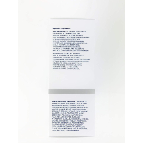 SQUALANE CLEANSER 50ml A Gentle, Moisturizing Facial Cleanser A gentle cleansing product formulated to target makeup removal whilst leaving the skin feeling smooth and moisturized. The formula incorporates Squalene, alongside other lipophilic esters that are gentle, moisturizing, efficient in dissolving makeup and facial impurities and increasing the spread ability of the product. When rubbed between your palms for approximately 10-30 seconds, the product undergoes an important textural change from a balm-like consistency to a clear oil-like consistency. This allows the emulsifying sucrose esters in the formula to trap and blend the dissolved makeup and facial impurities with water for rinsing. Being non-comedogenic and soap-free, this formula is designed to be gentle enough for daily use, without over-drying the skin, making it suitable for all skin types. HYALURONIC ACID 2% + B5 30ml A hydration support formula with ultra-pure, vegan hyaluronic acid “Hyaluronic Acid (HA) can attract up to 1, 000 times its weight in water. The molecular size of HA determines its depth of delivery in the skin. This formulation combines low-, medium- and high-molecular weight HA, as well as a next-generation HA cross polymer at a combined concentration of 2% for multi-depth hydration in a water-based formula. This system is supported with the addition of Vitamin B5 which also enhances surface hydration. NATURAL MOISTURIZING FACTORS + HA 30ml Surface hydration formula “Natural Moisturizing Factors (NMF) are elements that keep the outer layer of the skin protected and well-hydrated. NMF are made up of multiple amino acids, fatty acids, triglycerides, urea, ceramides, phospholipids, glycerine, saccharides, sodium PCA, hyaluronic acid and many other compounds that are naturally present in the skin. This formula offers non-greasy hydration that acts as a direct topical supplement of impaired NMF components.