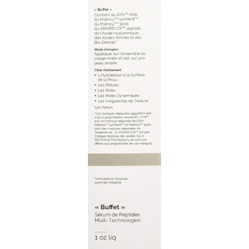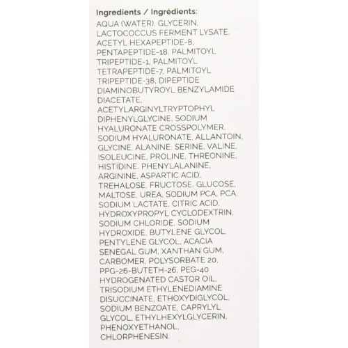 This formula combines a comprehensive array of studied technologies to target multiple signs of aging at once. The technologies are Matrixyl 3000 peptide complex (with palmitoyl tetrapeptide-7), Matrixyl synthe’6 peptide complex (with palmitoyl tripeptide-38), SYN-AKE peptide complex (with dipeptide diaminobutyroyl benzylamide diacetate), ARGIRELOX peptide complex (with acetyl hexapeptide-8, pentapeptide-18), Probiotic complex (with lactococcus lactis lysate), in a base of 11 skin-friendly amino acids and multiple hyaluronic acid complexes. The total concentration of these technologies in the formula by weight is 25.1%.