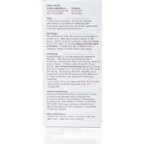 Active Ingredients: Titanium Dioxide 8%, Zinc Oxide 3.8% Inactive Ingredients: Alumina, Cyclohexasiloxane, Cyclopentasiloxane, Dimethicone, Dimethicone Crosspolymer, Dimethicone/Vinyl Dimethicone Crosspolymer, Dimethiconol, Iron Oxide (CI 77491), Lauryl PEG/PPG-18/18 Methicone, Hydrogen Dimethicone, PEG-10 Dimethicone, Tetrahexyldecyl Ascorbate, Tocopheryl Acetate