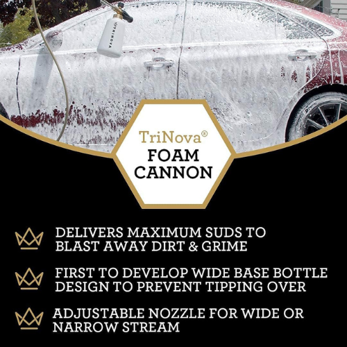 TriNova’s premium foam cannon is designed to deliver maximum suds to ensure your ride gets squeaky clean. Adjust the nozzle for narrow or wide steam, and use the air intake knob to create more or less foam. Compatible with standard pressure washer quick connect attachments.