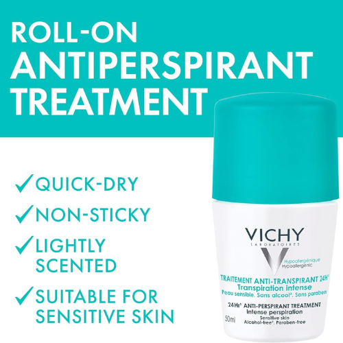 Vichy 48 Hour Anti-Perspirant Treatment Roll-On provides an immediate fresh sensation with long-lasting anti-perspiration efficacy and comfort. This formula leaves no white marks or yellow stains, and helps to prevent clothes from stiffening under the arm. Ideal for sensitive skin. Comes in 50 ml size.