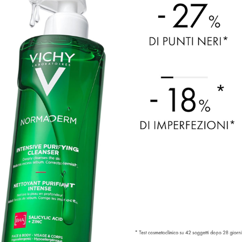 Vichy Normaderm Phytosolution Intense Purifying Gel 400ml is a purifying cleansing gel for oily, acne-prone skins, mineral-enriched and probiotic-rich, that perfectly removes impurities and sebum excess. This gel is formulated from 3 powerful anti-blemish active ingredients in a plant-based cleansing base with physiological pH 5.5: zinc, an anti-bacterial and anti-inflammatory agent, copper regulates the sebum, probiotics allow to strengthen the skin barrier. The formula also contains Vichy Mineralizing Water. The skin is matified and less oily. Pores and blackheads are reduced. The skin texture is refined. Hypoallergenic (formulated to minimize the risk of allergy). Suitable for sensitive skins. Tested under dermatological control.