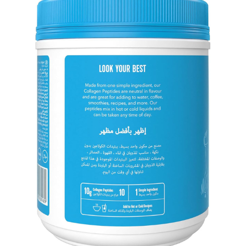 Vital Proteins Collagen Peptides is here to give your body the boost it needs so you can look and feel your best! The powdered food supplement is sourced from grass-fed, pasture-raised bovine hides from Brazil to ensure a natural, high-quality, and sustainable source of this ancient nutritional powerhouse. Made with only one ingredient, hydrolysed collagen, our Collagen Peptides is easily and quickly digested and absorbed by the body. The collagen powder ensures the cohesion, elasticity, and regeneration of your skin, hair, nails, tendons, cartilage, bones, and joints. All you need to take full advantage of this product is one scoop a day mixed with water or your favorite hot or cold drink or dishes, be it coffee, tea, or a smoothie. Designed for your wellbeing, the flavourless and odourless Vital Proteins Collagen Peptides is Paleo certified, Whole30 approved, and made without any added sugars, sweeteners, gluten, or dairy. The canister includes a scoop for measurement. Every scoop (one serving) contains 10 g of collagen peptides.